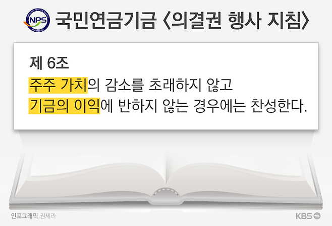 국민연금의 운용 지침을 보면 의결권 행사 방향을 결정하는 기준은 '주주 가치와 국민연금의 이익'으로 돼 있습니다.