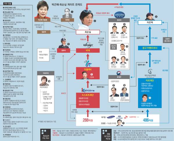 무슨 이유인지 그 까다로운 문화체육관광부 공무원들이 세종시에서 서울로 출장까지 와서 K스포츠재단 설립허가증을 하루 만에 발급했다. 삼성·현대차·SK·LG·포스코 등 19개 재벌·대기업들은 K스포츠재단에 피 같은 돈 288억원을 아무 조건 없이 냈다. 안종범 당시 청와대 경제수석(57·구속)이 압력을 넣고 이승철 전국경제인연합회 부회장(57)이 총대를 멨다는 이야기가 나왔다. 최순실은 이왕 만드는 김에 ‘미르’라는 재단을 하나 더 만든다. 정관 등이 K스포츠재단과 똑같은 쌍둥이 조직이고 출범 일정도 비슷하다. ‘한 몸에 머리만 둘’이다. 미르재단에는 재벌 돈 486억원이 모였다. 지난해 10월 말에 있었던 일이다.