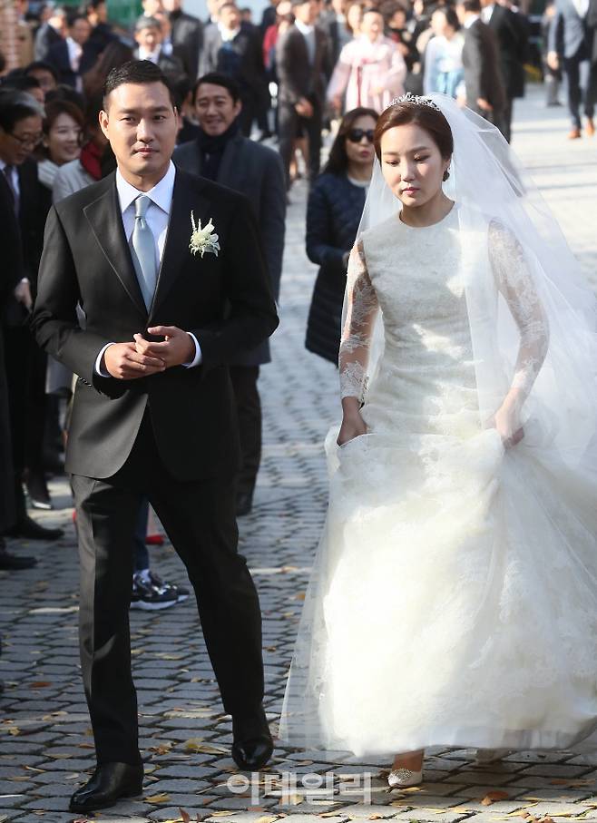 정몽구 현대차그룹 회장의 외손녀 선아영(30. 오른쪽)씨와 탤런트 길용우씨의 아들 길성진(32)씨가 11일 서울 명동성당에서 결혼식 기념 촬영을 위해 이동하고 있다. 선아영씨는 정몽구 회장의 장녀 정성이 고문의 딸이다. 길성진씨는 대학생으로 대학원 진학을 준비하고 있다. 이날 결혼식에는 정몽구 회장, 정의선 현대차그룹 부회장, 배우 서인석 최명길 노주현 등이 참석했다. /노진환 기자
