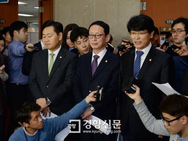 새누리당, 더불어민주당, 국민의당 등 여야 3당 원내수석부대표들이 14일 국회 정론관에서 '최순실 게이트' 의혹 규명을 위한 특검법과 국정조사 계획서를 오는 17일 본회의에서 처리하기로 합의한 것과 관련해 기자회견을 한 뒤 질문에 답하고 있다.