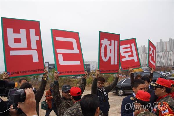 | ▲ 박정희 탄신제가 열린 14일 오전 구미 아사히글라스 해고노동자들이 '박근혜 퇴진' 피켓을 들고 시위를 벌이자 참가자 일부가 피켓을 빼앗기 위해 목덜미를 잡아 넘어뜨리고 있다 |