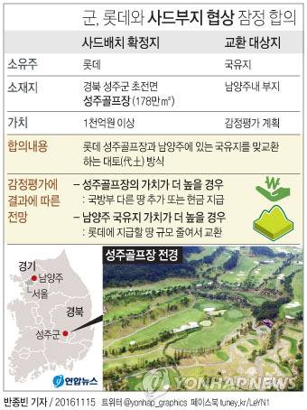 국방부와 롯데 측은 성주골프장과 남양주에 있는 국유지를 맞교환하는 대토(代土) 방식으로 부지 협상을 마무리 짓고 이를 16일 발표할 예정이다.