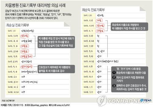 최씨 자매의 진료기록부상에는 '박대표', '대표님', '안가', '청'이라는 단어가 2011년부터 2014년까지 총 29회 기재되어 있다.