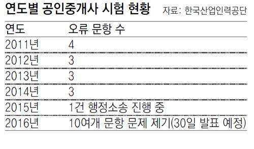 15일 부동산업계에 따르면 공인중개사 자격시험은 2004년부터 지난해까지 두 해(2007, 2015년)를 제외하고 매년 문제에서 오류가 발견돼 해당 문항의 정답을 정정하고 합격자를 다시 공고하는 혼란을 빚어왔다. 지난해에는 산업인력공단이 문제에 아무런 오류가 없다고 결론을 내렸지만 이에 불복한 일부 수험생이 청구한 행정소송이 현재 진행 중이다.