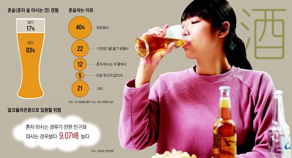 혼자 술마시는 사람을 칭하는 '혼술족'이라는 신조어가 생길 정도로 나홀로 술을 마시는 사람이 늘고 있다. 1인 가구 증가, SNS 확산으로 직접적인 소통 부재, 사회경제적 불안 심리가 확대되면서 '혼술'을 하는 사람이 많아지는 것이다. 최근 알코올질환 전문 다사랑중앙병원이 혼자 사는 사람 363명을 대상으로 설문조사를 한 결과, 응답자의 83%가 혼술 경험이 있었다.