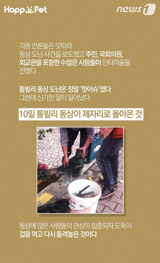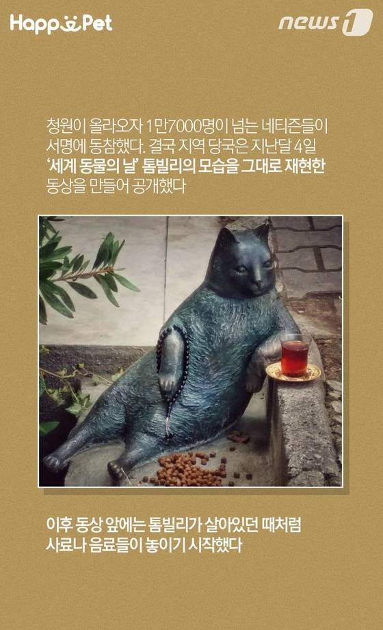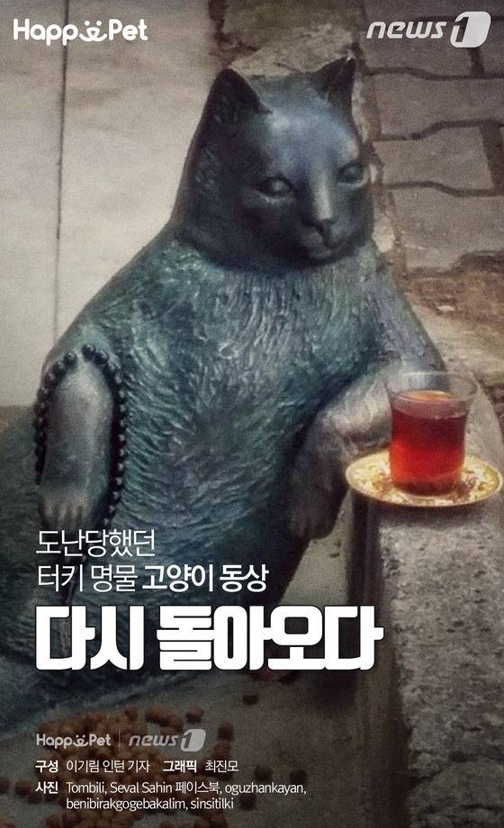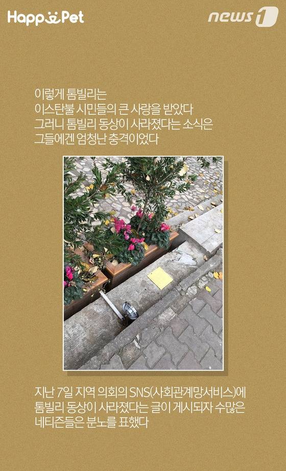 (서울=뉴스1) 이기림 인턴기자,최진모 디자이너 = 터키 이스탄불에서 토실토실한 몸을 가지고 편안한 '사장님 자세'로 앉아 유명세를 탄 고양이 '톰빌리'의 동상이 지난 7일(현지시간) 도난당했다. 살아있을 때도, 죽고 나서도 큰 사랑을 받던 톰빌리의 기념물이었기에 사람들이 느끼는 충격은 더욱 컸다. 그러나 10일 동상은 사랑의 힘으로 제자리를 찾았다. 고양이 동상에 얽힌 사연을 지금부터 전한다.