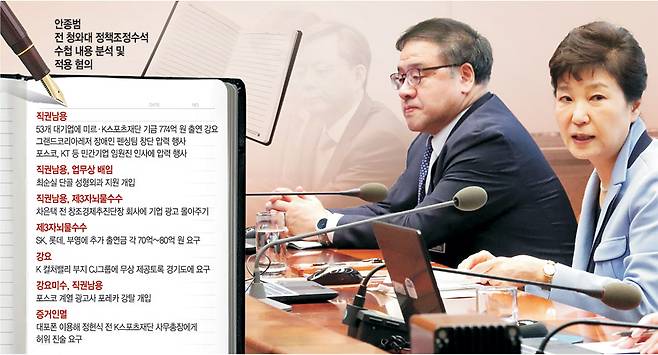 ‘최순실 국정농단 사건’을 수사 중인 검찰이 구속된 안종범(57) 전 청와대 정책조정수석의 수첩을 분석한 결과, 박근혜 대통령이 안 전 수석에게 대기업을 상대로 한 구체적인 모금액수, 민간 기업 인사 개입 등 위법·탈법 행위를 구체적으로 지시하는 내용이 적시돼 있는 것을 확인했다. 청와대 측이 검찰의 박 대통령 직접 조사를 미루고 있는 가운데 이같은 사실이 드러남에 따라 박 대통령을 향한 검찰의 수사가 급물살을 탈 것으로 관측된다.