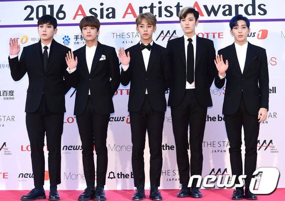 (서울=뉴스1스타) 권현진 기자 = 비에이피(B.A.P)가 16일 오후 서울 경희대학교 평화의전당에서 열린 '2016 아시아 아티스트 어워즈(Asia Artist Awards / 이하 AAA)’ 시상식에 참석해 포즈를 취하고 있다. 왼쪽부터 힘찬, 영재, 대현, 젤로, 종업.