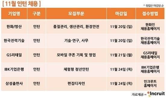 11월 넷째 주 대기업·공공기관 인턴 채용공고 정리