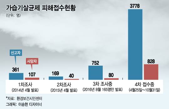 환경보건시민센터와 가습기살균제 피해자 모임에 따르면 지난달까지 정부의 피해접수 공식창구인 환경부 산하 한국환경산업기술원에 접수된 가습기살균제 피해자는 누적 기준 5060명으로 원진레이온 사건의 5배가 넘는다. 서울시가 지난 9월 가습기살균제 피해현황 파악 용역에 착수하면서 추가 피해자가 드러날 가능성도 높다. 1000억원대 기금이 조성될 가능성이 적잖은 셈이다.