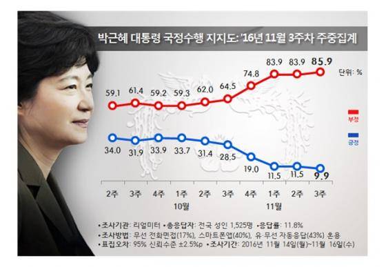 여론조사 업체 리얼미터가 14~16일 3일간 전국 1525명을 대상으로 조사한 11월 3주차 주중집계 결과 박 대통령의 국정수행 지지율은 지난주보다 1.6%포인트 내린 9.9%를 기록했다. 리얼미터 집계상으로는 처음으로 한자릿수로 내려앉았다. 부정평가 역시 2%포인트 오른 85.9%로 취임 후 최고치를 경신했다.