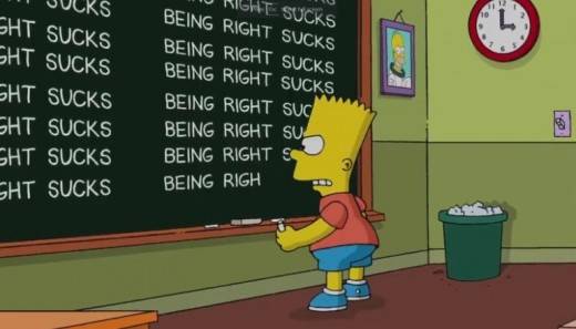 팬들 사이에서는 '카우치 개그'라 불리는 '심슨 가족'의 오프닝에 등장한 문장이다. 지난 14일(현지시간) 방영된 폭스TV 애니메이션 '심슨 가족'의 오프닝에서 주인공 바트 심슨은 학교 칠판에 'BEING RIGHT SUCKS'를 반복해 썼다. 바트가 칠판에 반성문을 쓰는 이 장면은 매회 '심슨 가족' 오프닝에 등장하지만 칠판에 적히는 내용은 매번 다르다. 그동안 제작진이 전하고픈 메시지를 담는 경우가 많았고, 14일 방송분도 그랬다.