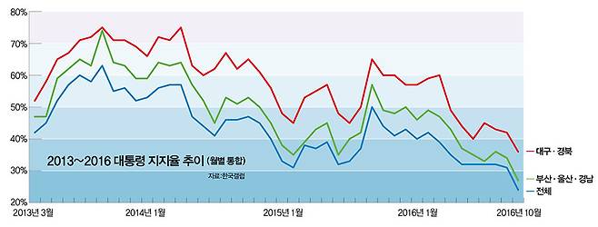 아래 <표>는 한국갤럽 매주 정례조사를 월 단위로 통합한 결과다. 박근혜 대통령 임기 동안 국정 지지도 추이를 보여준다. 아래에서부터 전국 평균 지지도, 부산·울산·경남 지지도, 대구·경북 지지도다. 지지도 추이를 보면, 모든 달에 예외 없이 ‘대구·경북-부산·울산·경남-전국 평균’ 순서로 지지도가 높다. 그런데 부산·울산·경남의 지지도 추이는 상대적으로 전국 평균에 더 가깝게 움직인다.