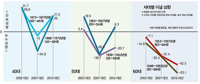 1968~1977년생은 2017년 대선 해를 기준으로 40대에 해당한다. 2012년 대선(당시 35~44세)에서 이 세대는, 10년 전인 2002년(당시 25~34세)에 보여준 확고한 진보 지지 성향을 거의 회복했다. 2017년 기준으로 60대인 1948~1957년생의 궤적은 정반대다. 이 세대는 이명박 후보가 압승한 2007년보다도 2012년 대선 투표 성향이 더 보수적이다. 연령효과가 뚜렷이 작동했다.