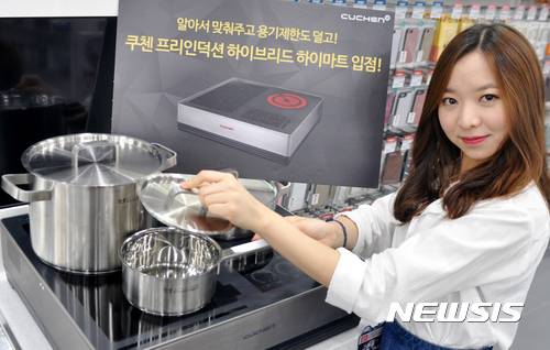 【서울=뉴시스】18일 서울 송파구 잠실 하이마트 월드타워점에서 모델이 쿠첸 프리인덕션 하이브리드를 선보이고 있다. 2016.11.18. (사진=쿠첸 제공)