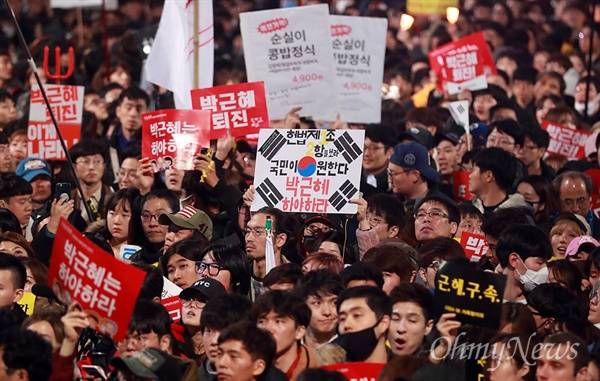| ▲ 지난 13일 오전 서울 종로구 경복궁역 앞에서 '박근혜 하야하라! 3차 범국민행동 촛불문화제'에 참가한 학생과 시민들이 '최순실 게이트'로 불거진 국정농단 사태에 대해 박근혜 대통령의 하야를 촉구하며 청와대 행진을 시도하고 있다. |