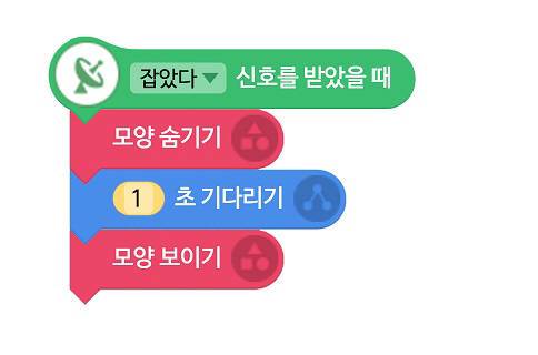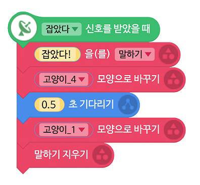 이렇게 코드를 만들면 고양이가 쥐와 만날 때마다 `잡았다` 신호를 보내요. 이제 `잡았다` 신호를 받았을 때 고양이가 말을 하고 얼굴 표정이 잠깐 바뀌도록 해 볼게요. [시작]에서 `잡았다 신호를 받았을 때` 블록을 가지고와서 그 아래에 [생김새]에서 `말하기` `모양으로 바꾸기` `말하기 지우기` 블록과 [흐름]에서 `~초 기다리기` 블록을 가져와 연결해요. 다음과 같이 코드를 완성했다면 [시작하기]를 눌러서 고양이가 쥐와 만날 때 어떤 일이 일어나는지 살펴볼게요.