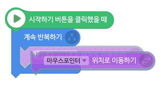 먼저 게임이 시작되면 고양이가 마우스를 계속 따라오도록 만들어 봐요. 고양이 오브젝트를 클릭하고 [흐름]에서 `계속 반복하기` 블록과 [움직임]에서 `마우스포인터 위치로 이동하기` 블록을 사용해 아래처럼 코드를 만들어 볼게요.