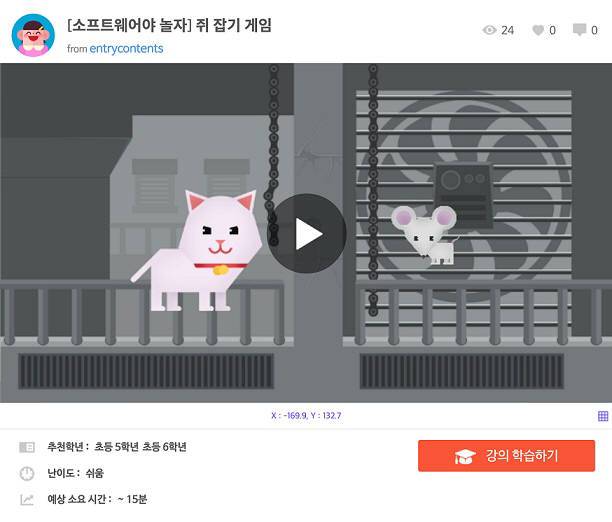 오늘 만들 작품이 있는 페이지에 접속하고(goo.gl/Y3uNsP) 화면 중앙에 시작하기 버튼을 클릭해요. 마우스를 움직이면 고양이가 마우스를 따라와요. 쥐는 화면을 이리저리 돌아다니네요. 마우스를 움직여 쥐를 잡아 볼게요.