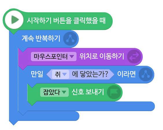 이어서 고양이와 쥐가 서로 만났을 때 앞에서 살펴본 행동을 하도록 해보죠. [흐름]에서 `만일 ~이라면` 블록과 [판단]에서 `쥐에 닿았는가` 블록을 연결해 고양이가 쥐에 닿았을 때만 특정 명령을 실행하도록 코드를 만들어요. 또 [시작]에서 `잡았다 신호보내기` 블록을 가져와 `만일 ~이라면` 블록 안에 넣어요. 완성된 코드는 다음과 같아요.