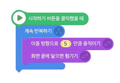 시작하기 버튼을 눌렀을 때 쥐가 화면 속에서 이리저리 도망 다니도록, 또 고양이와 닿았을 때는 잠시 사라졌다가 다시 등장하도록 쥐 오브젝트를 누르고 다음과 같이 코드를 작성해요.