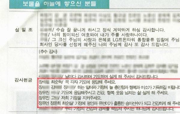 "이번 승자대회 자체 1등이 되게 기도 드립니다."(정유연) - 13.04.12. 감사헌금 기도제목 중에서(최순실씨는 이날 자로 건축헌금, 선교헌금을 했다.)