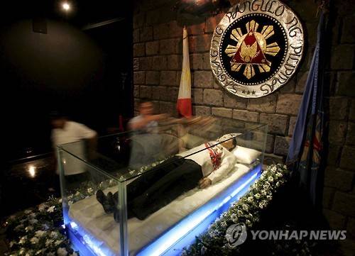epa05636222 (FILE) A file picture dated 11 September 2005 shows a worker wipeing the glass crypt containing the body of late dictator Ferdinand E. Marcos before a commemoration ceremony on his 88th birthday at the mausoleum in Batac, Ilocos Norte northern Philippines. Marcos died on 28 September 1989, in Hawaii, USA, after being forced out of the Malacanang presidential palace by the civilian-backed military uprising in 1986. His burial was held on 18 November 2016, at the Heroes' Cemetery in Manila, ten days after the Supreme Court authorized his funeral. Marcos's body, which was kept in a mausoleum in the north of the country, was flown to Manila without the authorities announcing the event, media reported. Many Filipinos protested his burial over his alleged responsibility for thousands of executions, tortures and disappearances during his regime. EPA/DENNIS M. SABANGAN