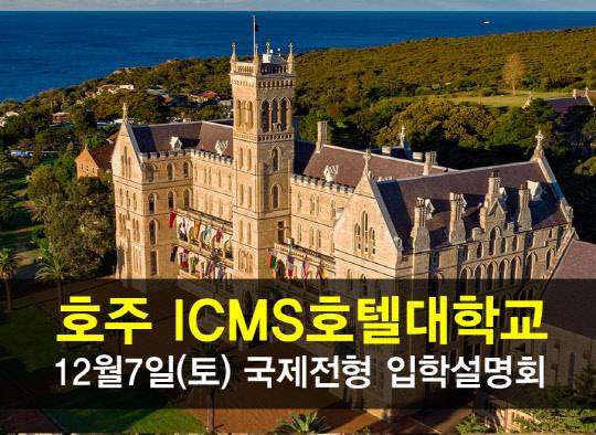 호주명문 ICMS호텔대학교 1+2 국제전형 신입생 입학 설명회가 오는 12월 17일(토) 오후 2시부터 서울 강남에서 개최된다. 이번 호주 대학교 입학설명회는 호주 현지 매니저가 직접 방한하여 진행한다.