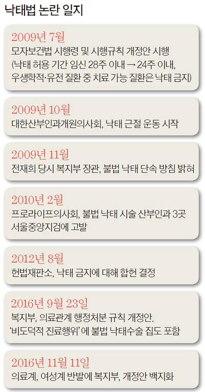 최근 정부가 불법 낙태수술(인공 임신중절수술)을 집도한 의사 처벌을 강화하기로 했다가 의사와 여성단체의 반발에 밀려 약 50일 만에 철회했다. 상처를 서둘러 봉합했지만 염증은 그대로 남았다. 이번 기회에 낙태를 어떻게 할 것인지, 43년 전에 만든 낙태 허용 범위를 유지할지 논란이 가라앉지 않고 있다.