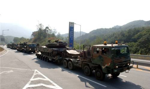 | K-1 전차를 실어나르고 있는 육군의 중장비 수송차량 |
