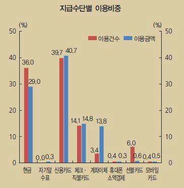 한국은행이 전국의 성인 남녀 2천500명을 대상으로 실시한 조사결과를 보면 지난해 우리 국민이 가장 많이 이용한 지급수단은 신용카드로 전체(건수 기준)의 39.7%를 차지했다. 전년의 31.4%에서 급격히 증가하며 현금을 추월했다.