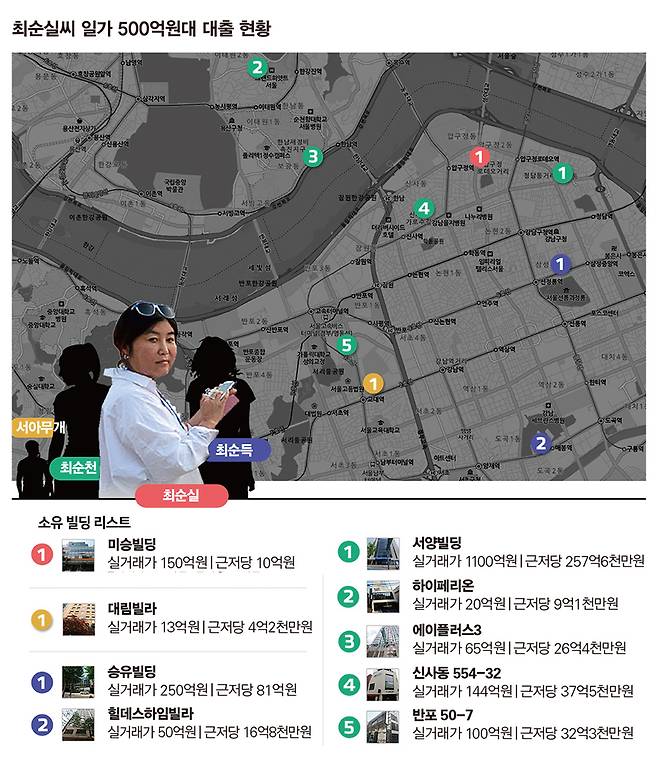 금융권과 법원에 따르면, 최순실씨와 언니 최순득씨(남편 장아무개씨), 동생 최순천씨(남편 서아무개씨) 등 세 자매는 서울 강남 일대와 용산구 이태원·한남동, 부산 해운대, 광주, 강원 평창, 제주도 일대 건물·토지 등 모두 30개 이상 부동산을 소유하고 있다. 최씨와 그 일가 소유 부동산의 등기부등본상에는 총 565억원의 근저당이 설정돼 있다. 현재까지 미상환된 채무만 254억원이 넘는다. 이에 최씨 일가가 담보대출을 통해 현금화한 금액은 200억원이 넘을 것으로 추산된다. 은행 관계자는 “최씨의 담보가 확실하기 때문에 은행에서도 망설임 없이 담보대출을 해 준 것”이라며 “빌딩과 토지가 있는데 못해 줄 이유가 없다. 그만큼 최씨 일가에게 부동산은 확실한 자금줄이 되어왔던 것”이라고 설명했다.