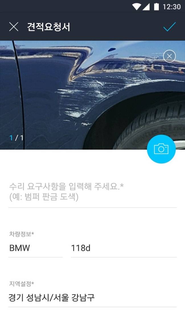 ‘바로 견적 요청’을 터치해 사고부위 사진을 첨부하고, 차량 정보를 기입하고 어느 지역에서 수리 받을 지를 결정한 뒤, 보험을 적용받을 지 여부를 알려주면 된다.