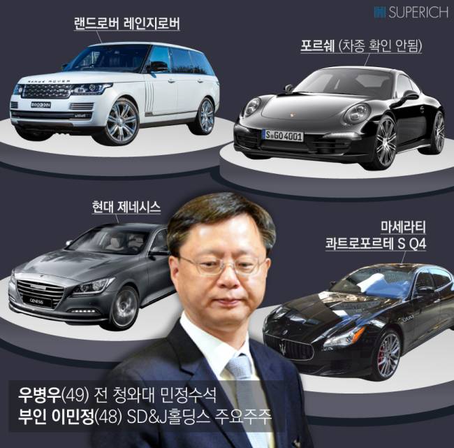 청와대 핵심 실세로 불린 우병우(49) 전 청와대 민정수석은 회삿돈으로 최고급 외제차를 타고 다닌 의혹을 받고 있다. 공직자 재산신고에서 보유 차량이 없다고 밝힌 우병우가 사는 서울 압구정동 현대아파트 단지에는 우병우 세대로 등록된 차량이 5대로 파악된다.