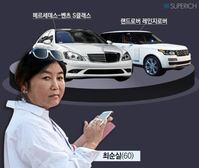 최순실은 국내에선 랜드로버의 레인지로버와 메르세데스-벤츠 S클래스를 소유하고 있다. 레인지로버의 판매가격은 약 1억6700만원에서 시작하며, 최상급인 롱휠베이스 오토바이오그라피 모델의 경우 2억2000만원에 달한다.