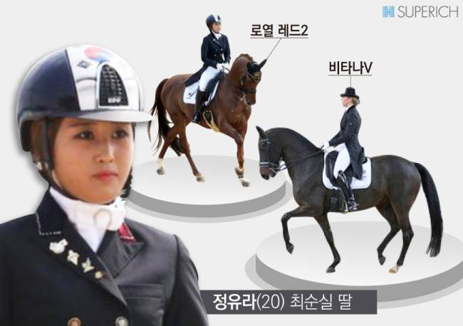 사실 최순실 일당이 탄 고급 외제차보다 훨씬 비싼 것이 최순실의 딸 정유라가 타는 말이다. 이화여대에 승마 특기생으로 입학한 정유라는 올해 14세 된 네덜란드 태생 명마 ‘비타나V’(VITANA V)를 타고 훈련했다.