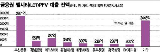지난해 9월18일 부산은행과 메리츠종합금융증권등 15개 금융사는 엘시티 사업을 위해 설립된 엘시티PFV와 대출약정서를 체결했다. 이 약정의 대출 한도는 1조7800억원이고, 약정기간은 2020년 3월20일까지다. 지난해 말 기준 대출 잔액은 8000억원이다. 이 덕분에 엘시티는 지난해 10월 분양에 나설 수 있었다.