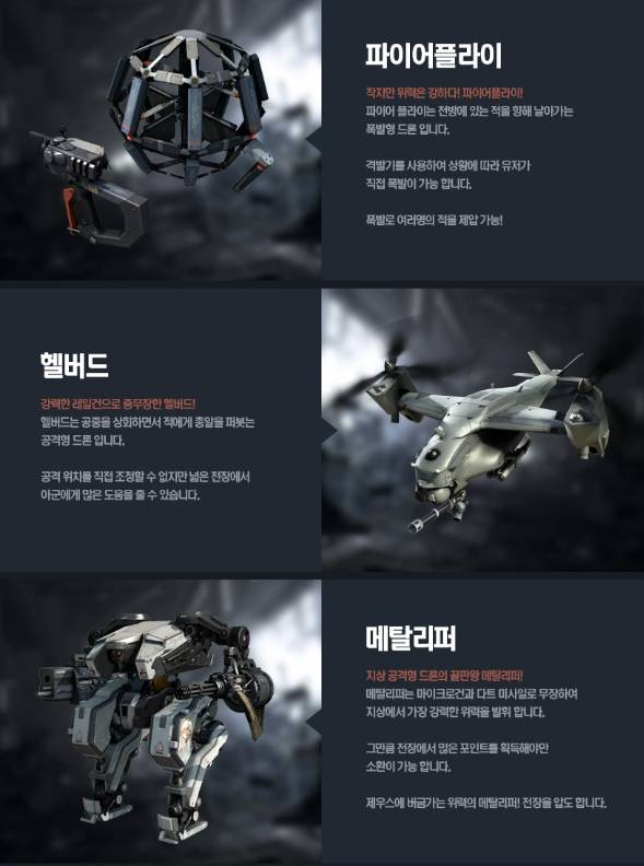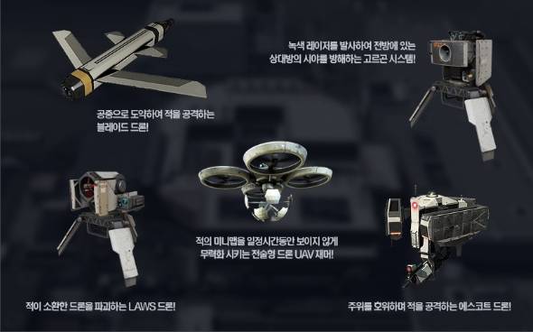 어떤 공격 드론을 선택하느냐는 유저의 전략적인 판단에 달렸다. '파이어플라이'는 전방의 적을 향해 날아가는 폭발형 드론으로, 한번에 여러 명의 적을 제압할 수 있다. 또 공중에서 총알을 퍼붓는 '헬버드'는 공격 위치를 조정할 수 없는 대신 넓은 전장에서 큰 활약을 펼친다.