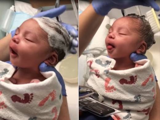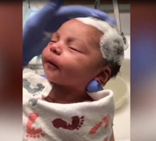 태어나 처음 머리를 감게 된 한 신생아의 사랑스러운 모습이 인터넷상에 공개돼 화제가 되고 있다. 타비욘 글렌이 19일 페이스북에 공개한 2분 40초 분량의 이 영상은 태어난지 하루밖에 안 된 아미라가 처음으로 머리 감기를 경험하는 모습을 담고 있다. 포대기에 둘러싸인 채 잠이 들어 있는 아미라를 담당 간호사가 팔에 안고 샴푸질을 해주며 머리를 감기는 것이다. 이어 수건으로 머리까지 말리는 것으로 아미라의 첫 머리 감기는 완료된다.