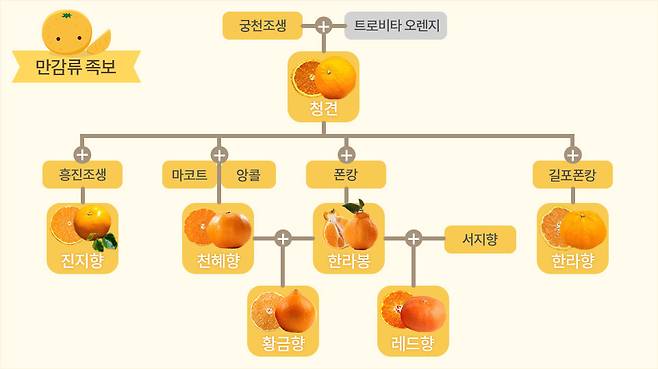 우리가 흔하게 먹는 귤이 '감귤류'이고, 감귤에서 변형된 한라봉·천혜향 등이 '만감류'에 속한다. 만감류는 완전히 익도록 오래 두었다가 늦게 수확한다는 의미를 담고 있다.