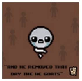 이미지의 중앙에는 '바인딩오브아이작'의 캐릭터 'The Lost'가 있고 그 주변에는 소년 8명의 그림자가 있었습니다. 하단에는 창세기 30장 35절의 문구가 적혀져 있고요.