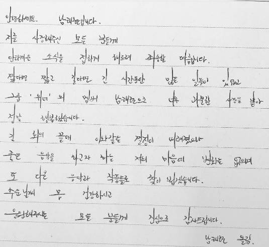 저를 사랑해주신 모든 분들께 안타까운 소식을 접하게 해드려 죄송할 따름입니다. 짧다면 짧고 길다면 긴 시간동안 많은 일들이 있었고 그룹 '위너'의 멤버 남태현으로 너무 과분한 사랑을 받아 정말 행복했습니다.