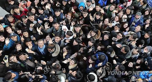(대전=연합뉴스) 이재림 기자 = 더불어민주당 문재인 전 대표가 28일 오후 대전 유성구 충남대 인근 커피숍에서 시국대화를 하고서 밖으로 나와 학생들에 둘러싸인 채 손을 흔들고 있다. 2016.11.28