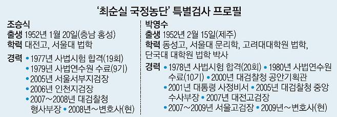 29일 ‘최순실 특별검사’ 후보로 추천된 조승식(64·사법연수원 9기)·박영수(64·10기) 변호사는 모두 강력부 검사 출신이다. 재직 시절 앞뒤 안 가리는 ‘강골(?骨) 검사’라는 평을 받았다. 수사 경험이 풍부하다는 것도 공통점이다.