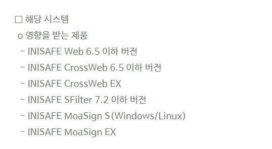 영향받는 제품은 △이니세이프 웹6.5 이하 버전 △이니세이프 크로스웹 6.5 이하 버전 △이니세이프 크로스웹 EX △이니세이프 에스필터 7.2 이하 버전 △이니세이프 모다사인 S(윈도/리눅스) △이니세이프 모다사인 EX 등이다.