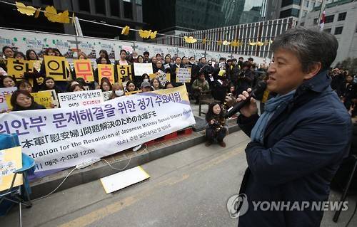 (서울=연합뉴스) 박동주 기자 = 30일 서울 종로구 옛 일본대사관 앞에서 열린 일본군 위안부 문제 해결을 위한 수요집회에서 배우 권해효씨가 인사말을 하고 있다. 2016.11.30