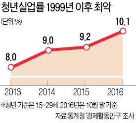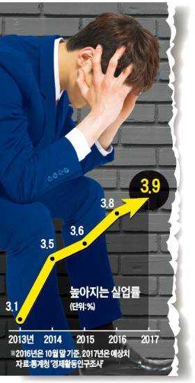 ‘최순실 국정농단 사태’로 정국이 혼란한 가운데 내년 실업률이 3.9%로 높아질 것이라는 전망이 나왔다. 고용시장이 외환위기 여파에서 벗어난 직후인 2001년(4.0%) 후 최고치다. 올해 청년실업률은 10월 말 기준 10.1%로 1999년(10.9%) 후 최악이었다.