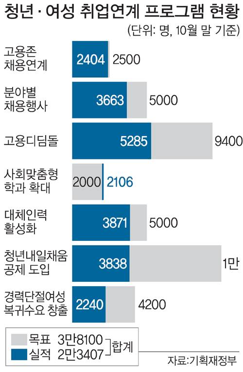 9400명이 목표였던 고용디딤돌은 5285명에, 5000명을 목표로 한 대체인력 활성화 정책에는 3871명만 참여했다. 경력단절여성 복귀 창출 사업은 당초 계획(4200명) 대비 53%인 2240명 채용에 머물렀다.
