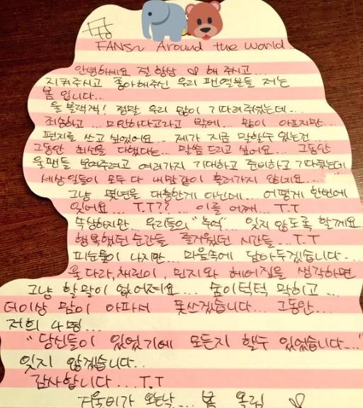 이어 "속상하지만 우리들의 추억 잊지 않도록 할게요. 행복했던 순간들 즐거웠던 시간들 피눈물이 나지만 마음 속에 담아두겠습니다"고 덧붙였다.