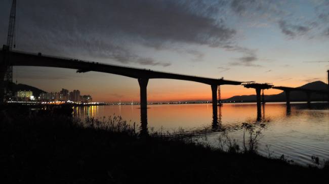 강을 가로지르는 불빛. 누가 설명해주지 않아도 알 수 있다. 저 불빛은 낙동강하굿둑 위에 조성된 도로를 비추는 불빛이다. 낙동강하굿둑과 가까워질수록 자전거의 속도가 더해졌다.